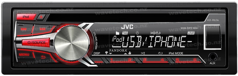 JVC's KD-R656 CD receiver puts you in command of your music when you're behind the wheel. You can use the handy front-panel USB port to access and control your iPod or iPhone playlists. The KD-R656 also includes a front auxiliary input for any other sound source.