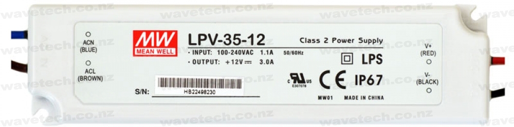 240V to 12V waterproof power supply with DC output of up to 3 amps, suitable to run lengths* of our LED strip lights from mains voltage safely!